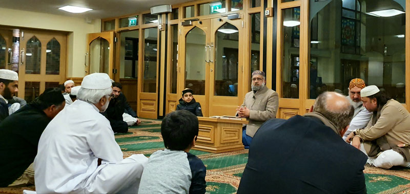 The gathering in Ashton Central Mosque was organized by Minhaj-ul-Qur’an (Ashton) in remembrance of Sarkar Alam Panah, Taaj-ul-Arifeen, Haji Hafiz Syed Waris Ali Shah (RahmaTullah’Alayh). Shortly after Salaat-al-Maghrib, the Glorious Qur’an was recited by Qari Hafiz Muhammad Zāhid Sharif Rizvi (Imam and Teacher at Ashton Central Mosque). Followed by a collective recitation of the Qasīdat al-Burda in honor of the Holy Prophet Muhammad ﷺ. Haji Muhammad Ashfaque Warsi (President MQI-Ashton) then led the recitation of the Durood-e-Minhaj, sending salutations upon the Beloved Prophet Muhammad ﷺ. Next, Qari Hafiz Muhammad Zāhid Sharif Rizvi led the collective recitation of the Wazaif (specified by Huzoor Shaykh-ul-Islam Dr. Muhammad Tahir-ul-Qadri for all Halqa-e-Durood gatherings); these Wazaif were printed and given to each congregant.