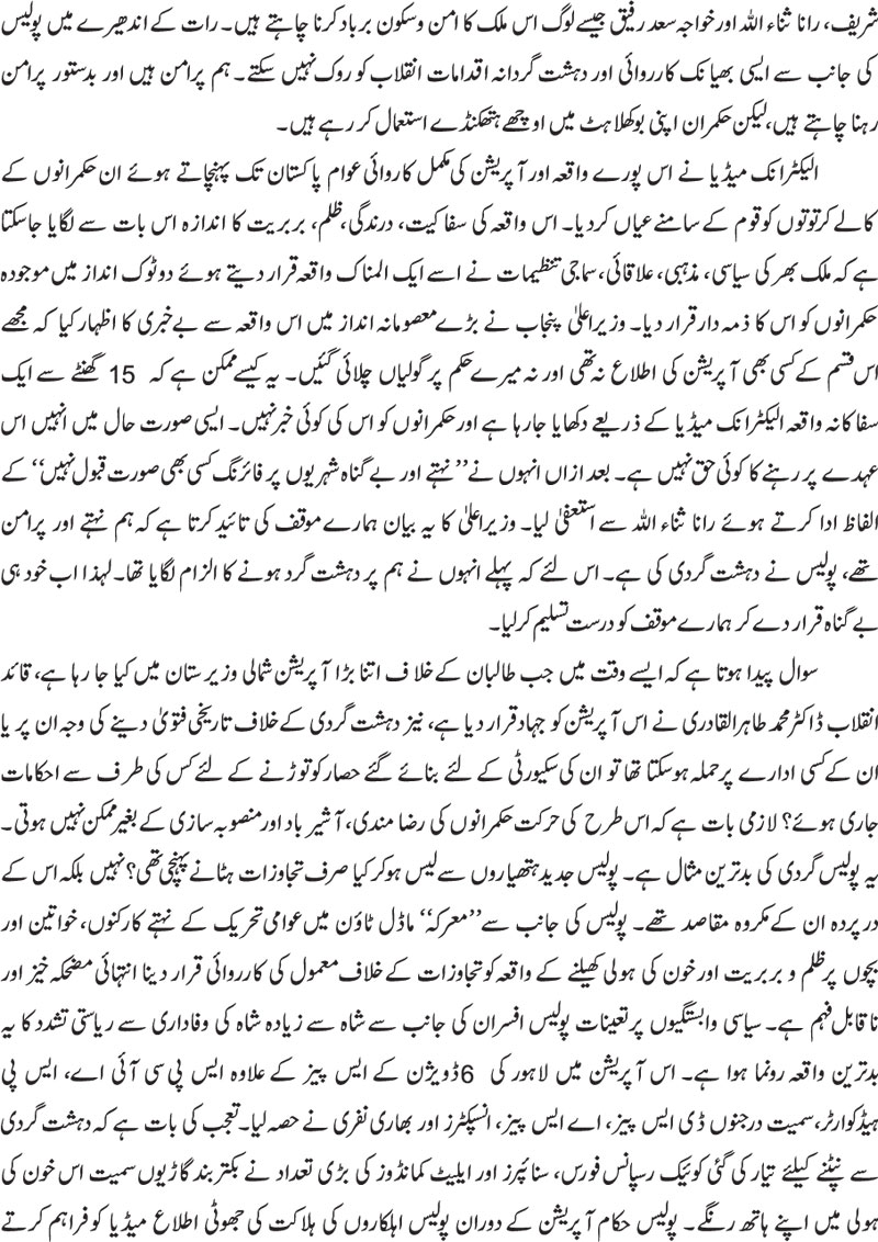 In addition to the SPs of six Divisions of Lahore Police, SP CIA, SP Headquarters, dozens of DSPs ASPs, inspectors and heavy contingents of police took part in the police action. It is equally surprising that quick response force, elite force, snipers and elite commandos who are trained to fight terrorism bloodied their hands by killing innocent people. Police officers kept on feeding false news of deaths of police officials to media during the operation. The fact of the matter is that not even a single police official died and these were common, innocent people who lost their lives. This horrible incident is nothing but a glaring instance of political vendetta. The people of Pakistan have also been conveyed a message crystal-clearly that the rulers would not hesitate to muzzle every single voice against them in total disregard of law, Constitution and morality and that they were free to act the way they liked. The incident represents a practical manifestation of this mindset and the statements given by the representatives of the government have further put a seal of approval on this mindset. The federal and provincial ministers are not ready even to express remorse on tragedy of such a level. They have unabashedly been defending the government on TV going to the extent of cooking up lies to justify themselves.
